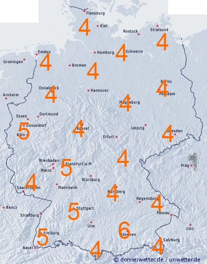 Die Trockenperiode im Norden unseres Landes wird unterbrochen. Bei den bis Montag 00 UTC zu erwartenden Niederschlagsmengen sind hier 10 bis 15 Liter pro Quadratmeter, örtlich auch mehr möglich. Wegen der seit Frühjahrsbeginn andauernden Trockenheit dürfte dies vorläufig aber nur der berühmte Tropfen auf den heißen Stein sein. Sonst liegen die Mengen jedoch in der Regel unter 10 Liter pro Quadratmeter. Lediglich am Alpenrand können staubedingt höhere Werte angestrebt werden. Meist trockenen Hauptes davon kommt der Südwesten. Hier fällt in den nächsten Tagen voraussichtlich bis auf wenige Ausnahmen kaum ein Tropfen Regen.