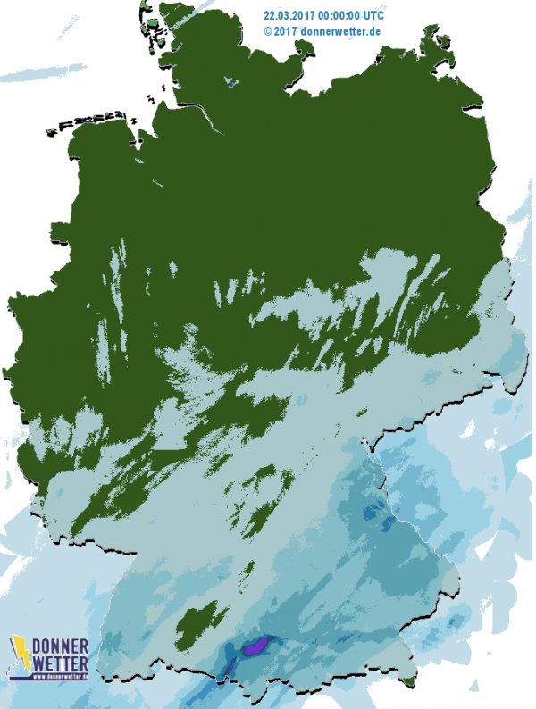 Diese scheinbar etwas intensivere Zone über Baden-Württemberg, wandert allmählich über die Mitte in den Nordosten. Daher kann es bis morgen Nachmittag gebietsweise etwas tröpfeln, oder leichten Regen geben. Mehr als 2 bis 4 Liter / m² sollten dabei aber nicht zusammen kommen.
