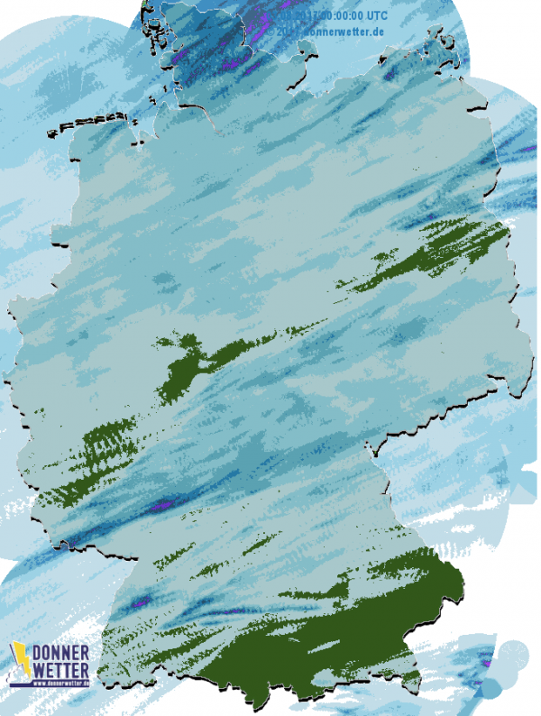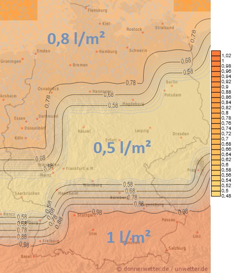 Heute muss hauptsächlich nur im Nordwesten, sowie am Alpenrand mit örtlichen Schauern und einzelnen Gewittern gerechnet werden. Dabei liegen die Niederschlagsmengen in der Regel unter 10 Liter pro Quadratmeter. Im Großteil von Deutschland bleibt es trocken.