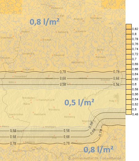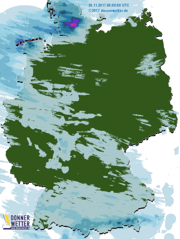 Heute dringt mit stark auffrischendem Wind von der Nordsee her neuer Regen bis ins Landesinnere vor. Die Schneefallgrenze steigt vorübergehend bis in die Gipfellagen der Mittelgebirge. Die Niederschlagsmengen erreichen meistens zwischen 5 und 20 Liter pro Quadratmeter. Im Süden bleibt es tagsüber zunächst eher trocken.