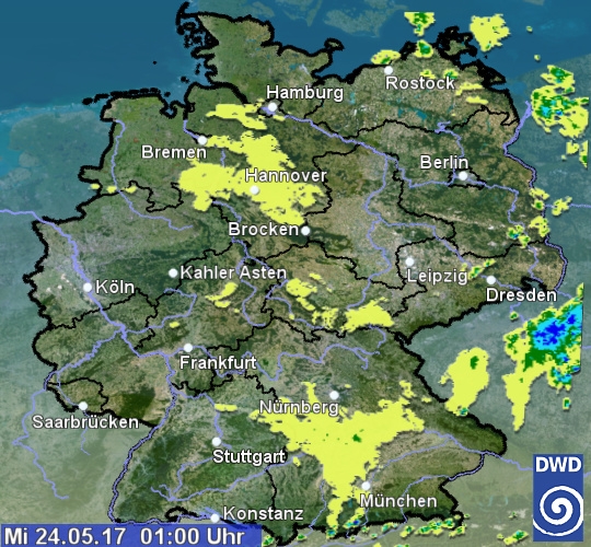 Das Radarbild zeigt aktuell im Nordosten noch einige schwache Signale. Hier fällt vereinzelt noch etwas Regen, oder es treten leichte Schauer auf. Die gelben Flecken von Niedersachsen bis Bayern deuten auf hohe und mittelhohe Wolken, aus denen zwar etwas Niederschlag fällt, dieser aber nicht den Boden erreicht. Gebietsweise ist der Himmel über Deutschland aber auch nur leicht bewölkt.