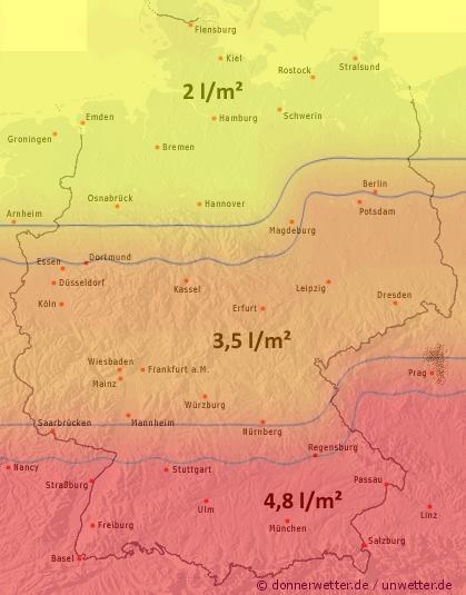 Dabei stieg die Verdunstung mit zunehmender Temperatur und Sonnenscheindauer auf Werte von bis zu 5 Litern pro Quadratmeter im Süden des Landes.