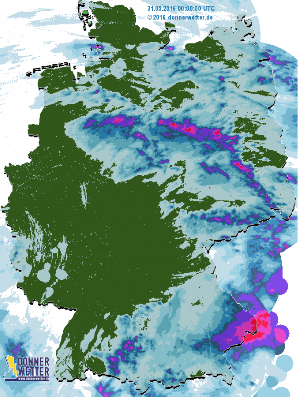 Insbesondere an der Grenze zu Tschechien, im Raum Passau, kam es zu teils schweren Unwettern mit Gewittern und Starkregen. Lokal kamen auch hier wieder mehr als 50 Millimeter Niederschlag in kurzer Zeit zusammen.