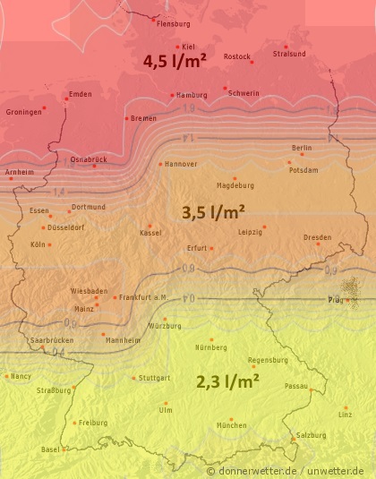 Südlich davon regnete es zum Teil länger und ergiebig. Insbesondere am Alpenrand kam es erneut zu Unwettern mit Starkregen. Lokal fielen in kurzer Zeit mehr als 50 Millimeter Niederschlag pro Quadratmeter.
