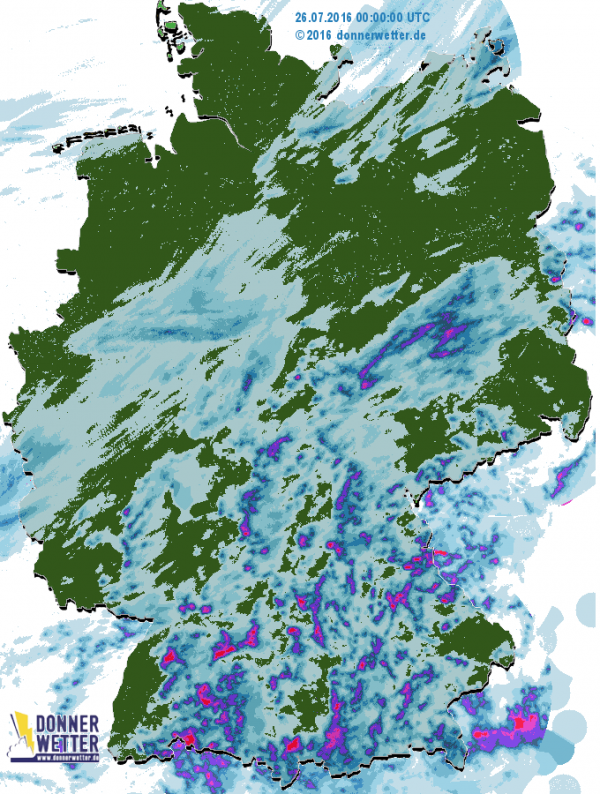 Bis zum Abend lösten sich die meisten Schauer- und Gewitterwolken dann wieder auf. Stattdessen zog ein neues Regenband von der Eifel nordostwärts und brachte im Lauf der ersten Nachthälfte auch Teilen West- und Norddeutschlands etwas Regen. Die Regenmengen waren jedoch meist nur gering.