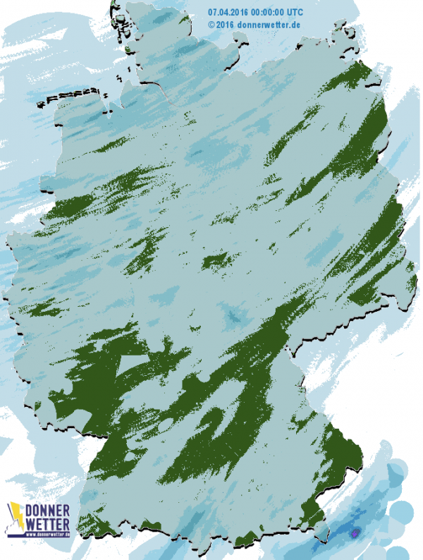 Sehr gut sind die Schauerspuren im 24-Stunden-Regenradar zu erkennen. Die Regenmengen waren allerdings mit 1 l/m2 meist gering. An einmigen Stellen blieb es auch trocken. Heute wird noch weniger Regen erwartet, nur in Bayern ist es lokal noch nass.