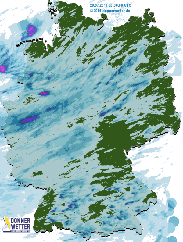 Am gestrigen Donnerstag zogen erneut viele dunkle Wolken mit teils lang anhaltendem Regen über das Land. Durchweg trocken blieb es nur in wenigen Ausnahmefällen im Schwarzwald und in Teilen Schleswig-Holsteins, Mecklenburg-Vorpommerns, Sachsens und Bayerns.