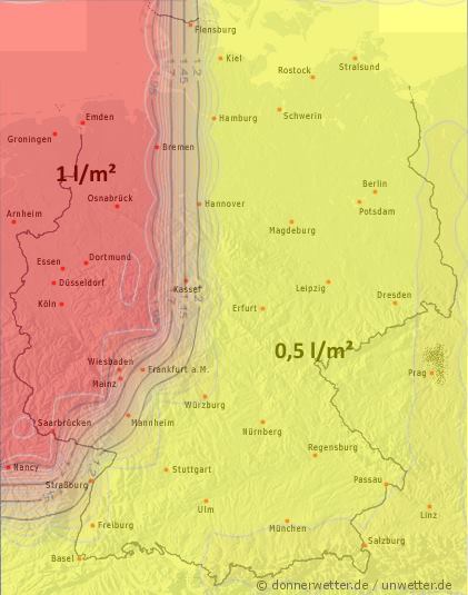 Dabei fielen verbreitet um die 5 Liter Regen pro Quadratmeter, in der Lausitz und Uckermark lokal bis zu 20 Liter und im Allgäu und Berchtesgadener Land sogar bis zu 35 Liter.
