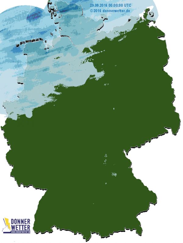 In der zweiten Tageshälfte erreichten Ausläufer des Tiefs von Nordwesten her das Land. In den darauffolgenden Stunden zog dieses erste dichte Regenband weiter südostwärts und erreichte am Abend auch die Ostsee und das Münsterland. Südlich der Linie Niederrhein-Usedom blieb es vorerst noch trocken, hier setzte der Regen erst in der Nacht oder in den Morgenstunden ein. Im Süden des Landes bleibt es auch heute noch trocken.