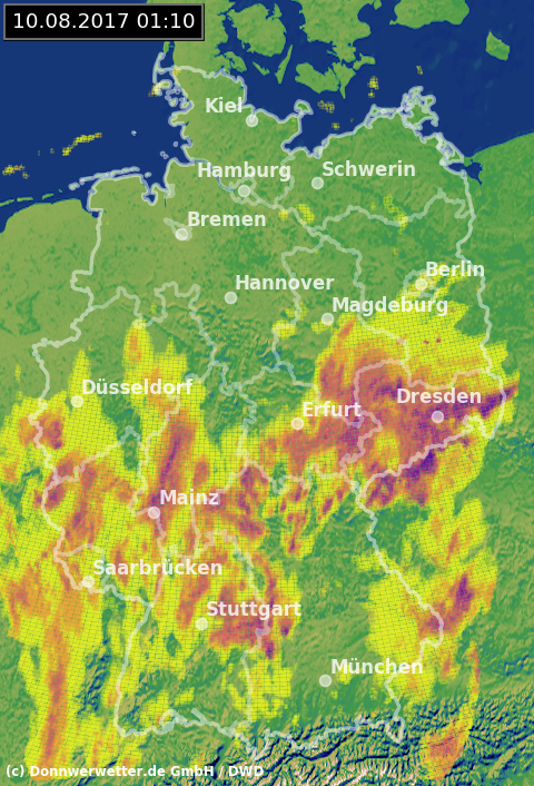 Das Radarbild zeigt aktuell über Sachsen und der Mitte kräftige Schauersignale, dabei blitzt und donnert es auch teilweise. Sonst formiert sich von Südwesten ein ausgeprägtes Regengebiet. Über dem Norden ist der Himmel teilweise sternenklar.