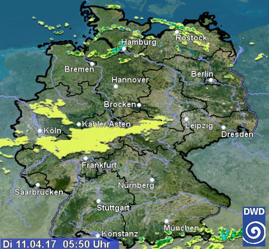 Das Radarbild zeigt aktuell noch einige mäßige Niederschlagssignale im südöstlichen Bayern. Bei München und Passau hat es vor kurzer Zeit auch noch geblitzt und gedonnert. Außerdem sind bei Hamburg und Rostock noch einzelne leichte Regenechos zu erkennen. Hier sind heute tagsüber einzelne Schauer unterwegs. Auch an den Alpen kann es noch schauern. In der Mitte regnet es trotz der gelben Radarfarbe kaum.