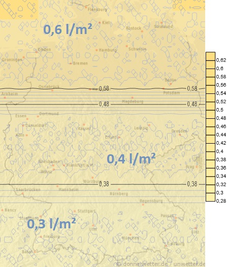 Am Freitag regnet es vor allem in der Südwesthälfte. Dabei sind Mengen zwischen 5 bis 15 Liter pro Quadratmeter zu erwarten.