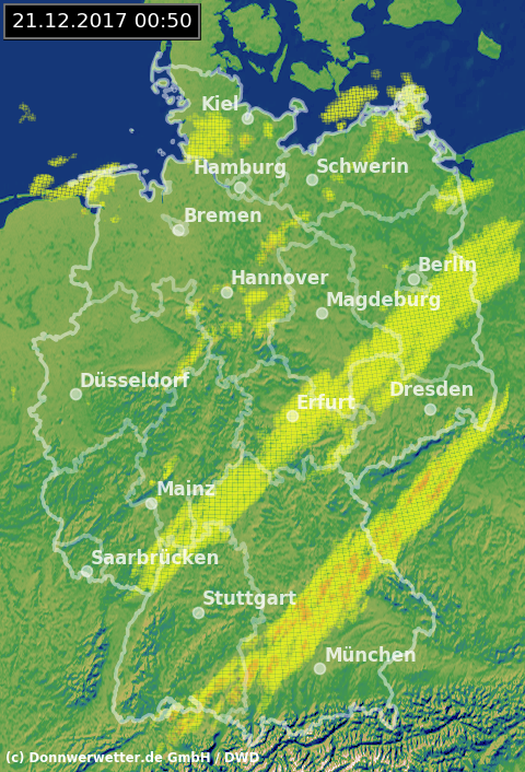 Das Radarbild zeigt aktuell einige Niederschlagsstreifen mit leichtem Regen und Sprühregen. In Bayern fällt vereinzelt Schnee oder Schneeregen. Sonst ist der Himmel über Deutschland meistens wolkenverhangen, nur direkt am Alpenrand zeigen sich die Sterne. Gebietsweise hält sich dichter Nebel.