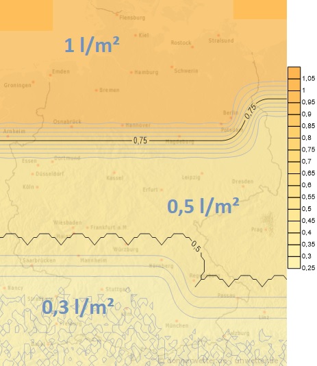 Heute entwickeln sich mit sonniger Einstrahlung vor allem im Süden und im Nordwesten wieder häufig Schauerwolken, vereinzelt auch mit Blitz und Donner. Die Niederschlagsmengen liegen dabei meist zwischen 1 und 10 Liter pro Quadratmeter, im Bereich der Alpen zum Teil auch deutlich mehr. In den anderen Gebieten Deutschlands bleibt es eher trocken.