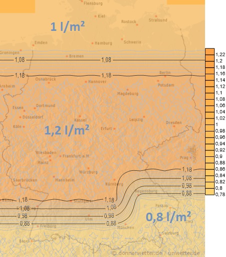 Heute tagsüber fällt vor allem in der Mitte und im Süden etwas Regen, oder es treten Schauer auf. Die Mengen liegen dabei zwischen 1 und 8 Liter pro Quadratmeter.