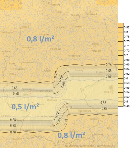 Heute stellt sich nach dem Durchzug des Regengebietes wechselhaftes und teilweise sehr windiges Schauerwetter ein. Im Bergland mischen sich auch Schneeflocken und Graupelkörner unter den Regen. Im Tagesverlauf werden die Schauer seltener und die Aufheiterungen nehmen zu. In der Nacht auf Montag kann es im Erzgebirge, im Bayrischen – Wald und an den Alpen noch zu etwas Schnee oder Schneeregen, in tieferen Lagen auch zu Regen kommen.