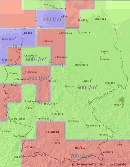Nur im Emsland und den Niederlanden speichern die Böden in ihren obersten beiden Metern aktuell weniger als 500 l/m². Durchschnittlich liegt die Wasserbilanz schwankt der Wassergehaltz bei Werten um 600 und 700 l/m² - sehr hohe Werte für diese Jahreszeit.