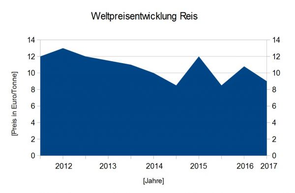 Um den Reisanbau steht es gut, denn hier ist der Preis, ebenso wie beim Weizen, weltweit gefallen. Jedoch gab es in den letzten Jahren größere Schwankungen als beim Weizen. Momentan liegt der Preis bei 9,39 Euro pro Tonne.
