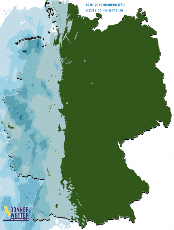 Das Radarbild vom Dienstag zeigt sich in der Westhälfte Deutschlands nass. Der Nordosten bis runter in den Südosten bleibt am Dienstag trocken.