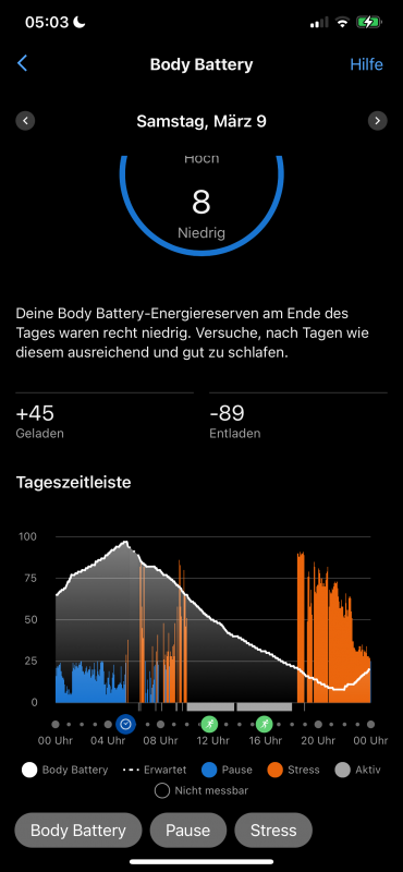 Die vor dem Lauf nahezu komplett gefüllten Energiereserven wurden bis zum Ende um etwa 90 Prozent aufgebraucht; selbst mit der Regeneration ab den späten Abendstunden stand der Körper noch immer unter Stress (rote Linien).