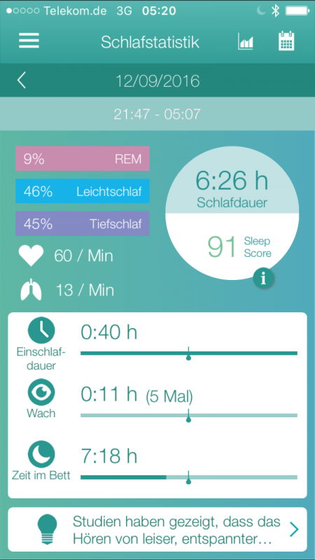 Zudem liefert die App nach jeder Nacht eine Schlafstatistik, die auch einen sogenannten Sleep Score beinhaltet. Dieser bewertet anhand sieben unterschiedlicher Parameter, z. B. Schlafzeit, Einschlafdauer und Aufwachhäufigkeit, wie gut die Nacht wirklich gewesen ist.