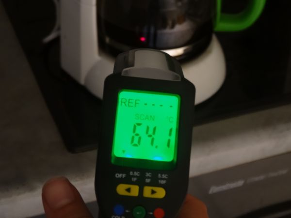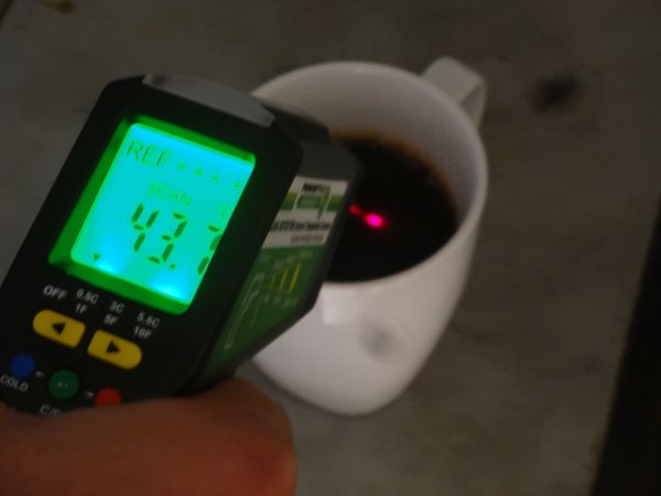 Als zu heiß und somit schwer trinkbar empfanden wir den Kaffee, als wir ihn unmittelbar nach dem Umfüllen in eine Tasse verzehren wollten. Deutlich an Temperatur, über 20 °C, verlor unser Kaffee bereits nach etwa 60 Sekunden (Bild unten).