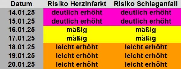 In dieser Woche ist mit zum Teil strengen Frostwerten vor allem in der ersten Wochenhälfte mit deutlich erhöhtenSchlaganfall- und Herzinfarktrisiken zu rechnen. Gefährdete Menschen sollten sich in dieser Zeit unbedingt schonen.