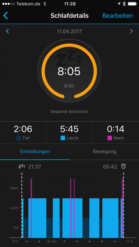 Unsere Testperson kommt mit dem Gerät auf eine Schlafdauer von rund 8 Stunden, 14 Minuten war sie in der Nacht kurzzeitig wach: