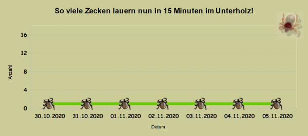 Die Wahrscheinlichkeit, von einem der Parasiten attackiert zu werden, ist jedoch eher gering: In den kommenden Tagen liegt sie bei 1-2 Zecken pro 15 Minuten.