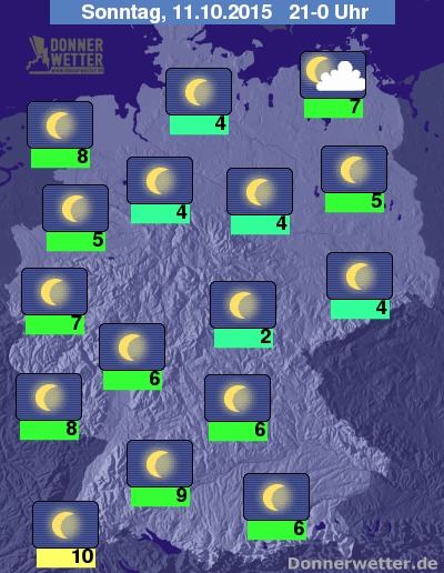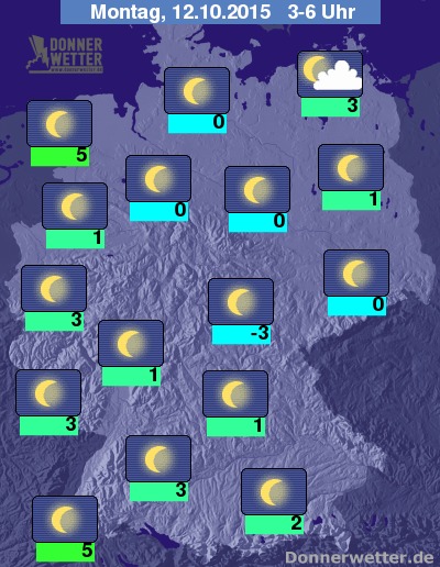 In der Nacht zum Montag sind im Ostseeumfeld teils einige Wolken möglich, im großen Rest der Republik zeigt sich jedoch ein sternenklarer Himmel und es bleibt trocken. Die Temperatur sinkt auf 5 Grad in Emden und bis auf frostige -3 Grad im Thüringer Becken.