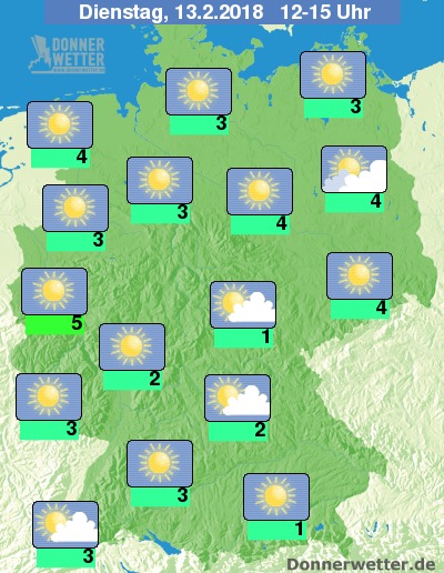 Heute Nachmittag strahlt die Sonne von einem oft wolkenlosen Himmel. Hier und da können lockere Wolken durchziehen, dabei bleibt es trocken. Die Temperatur steigt auf 1 Grad im Thüringer Becken und bis 5 Grad im Rheinland.
