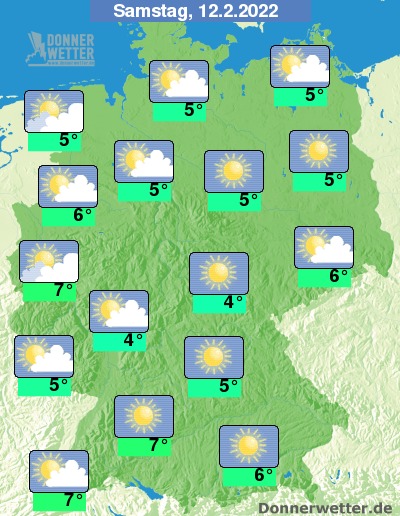 Heute zeigt sich das Wetter über dem Land vielerorts heiter bis sonnig. Im Tageserlauf können im Westen und Norden allerdings oft auch dichte Wolken aufziehen, es bleibt aber landesweit trocken. Die Temperatur steigt auf 4 Grad in in Erfurt und bis 7 Grad in Köln. An der Nordsee weht ein oft stürmischer Wind.