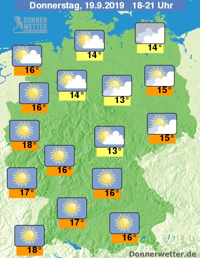 Am Abend halten sich in Teilen Mecklenburg-Vorpommerns noch dichtere Wolken, Regen fällt jedoch nicht mehr. Im großen Rest kann man die untergehende Sonne häufig noch genießen, im Süden und Westen auch meist von einem wolkenlosen Himmel.