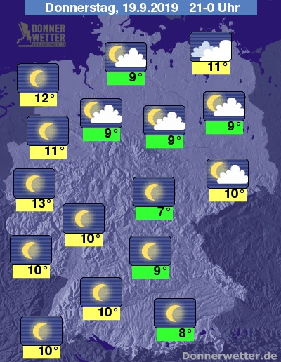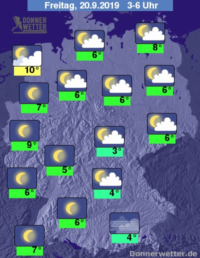 Bis zu den Frühstunden kühlt die Luft auf 2 bis 9 Grad ab, stellenweise gibt es leichten Bodenfrost. Am mildesten bleibt es an der Nordsee, sowie auf den Inseln mit Temperaturen meist noch im zweistelligen Bereich.