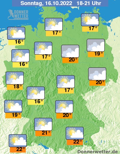 Am Montag zeigt sich das Wetter häufig heiter bis sonnig, hier und da bleibt es jedoch auch trüb, jedoch trocken. Im Nordwesten und Westen ziehen im Tagesverlauf zunehmend dichte Wolken herein, die gegen Abend Regen bringen können, sonst bleibt es trocken. Die Temperatur steigt auf 19 Grad in Cuxhaven und bis 25 Grad in Magdeburg.