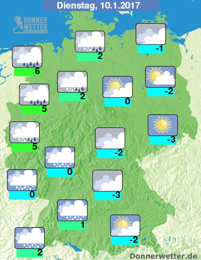 Die Temperaturen erreichen Höchstwerte um 1 Grad C im Thüringer Wald und um 5 Grad C im Rheinland.
