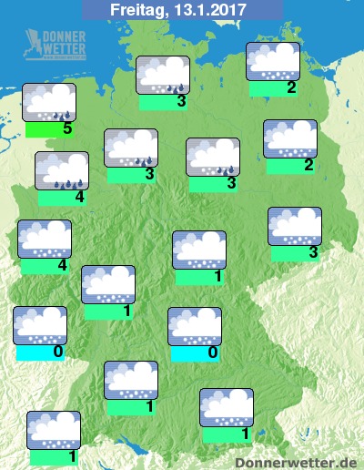 Der Freitag bietet nach aktuellem Stand ebenfalls kaum Sonnenschein, dafür setzt sich die nass-kalte Witterung auch kurz vorm Wochenende fort. Im Norden und Westen fällt dabei immer wieder Schneeregen, in den restlichen Landesteilen auch Schnee.