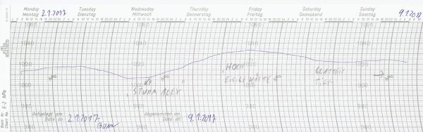 Der Schrieb zeigt den Luftdruckverlauf an unserer Wetterstation in Bonn (02.01.-09.01.2017). Zu erkennen gibt sich unter anderem Schneesturm "Axel" am Dienstag / Mittwich sowie der erneut abfallende Luftdruck am Samstag, welcher vor allem dem Norden und Westen des Landes Blitzeis bescherte.