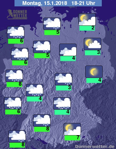 Heute Abend breiten sich die kompakten Wolken und der Regen weiter nach Osten hin aus. Im Süden und Südosten ist dabei auch Schneeregen möglich. Trocken und oft noch gering bis aufgelockert bewölkt ist es noch von Vorpommern bis nach Sachsen, sowie im äußeren Südosten der Republik. Die Temperatur liegt bei 2 Grad in Stralsund und 8 Grad in Köln. An den Küsten weht ein oft stürmischer Wind, dabei treten auch Sturmböen auf.