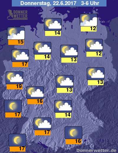 In der Nacht zum Donnerstag ziehen vor allem an den deutschen Küsten oft einige, meist jedoch noch aufgelockerte Wolken durch. In den übrigen Landesteilen ist es weitgehend locker bewölkt, besonders im Süden zeigt sich ein oft sternenklarer Himmel. Es bleibt landesweit trocken bei Tiefstwerten zwischen 19 und 12 Grad.