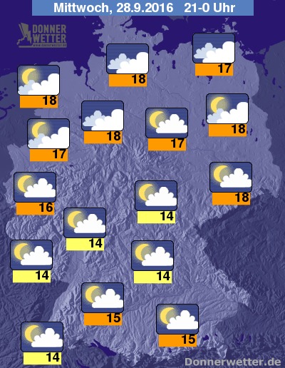Die Temperaturen erreichen zunächst noch Werte um 19 bis 23 Grad C und sinken in den späten Abendstunden auf 18 bis 14 Grad C ab.