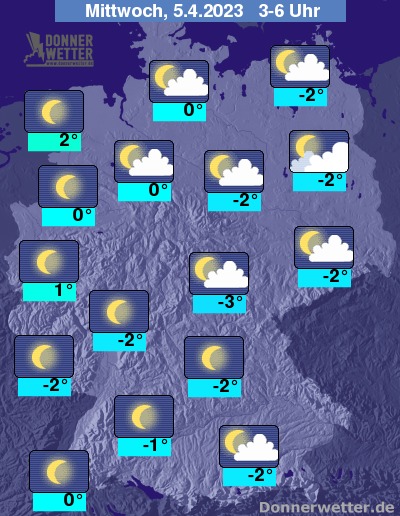 In der Nacht zum Mittwoch zeigt sich der Himmel über der Republik überwiegend sternenklar, vor allem im Osten und Nordosten ziehen zum Teil dichte Wolken durch. Bei Tiefstwerten von 2 Grad an der Nordsee und -3 Grad im Vogtland bleibt es trocken.