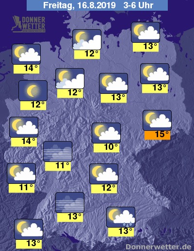 Während der zweiten Nachthälfte konzentrieren sich letzte Schauer auf das südöstliche Bayern, sonst wechseln sich Wolken mit Mond und Sterne ab und es bleibt überwiegend trocken. Im Rhein-Main-Gebiet und Schwaben kann sich stellenweise Nebel bilden.