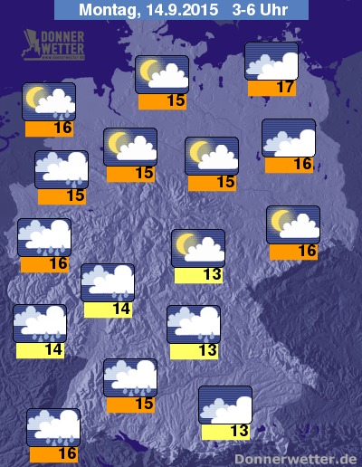In der Nacht zum Montag ziehen von Südwesten her kompakte Regenwolken herein, die sich bis zum Morgen etwa die gesamte Südwesthälfte der Republik erfassen, dabei fällt gebietsweise langanhaltender und ergiebiger Regen. Weiter nach Norden und Osten ist es hingegen weitgehend locker bis aufgelockert, und nur hier und da auch stark bewölkt, dabei bleibt es trocken. Die Temperatur sinkt auf 17 Grad in Rostock und bis 13 Grad in der Oberpfalz.