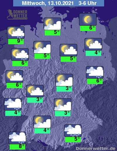 In der Nacht zum Mittwoch ziehen sich die Schauer mehr und mehr auf den Alpenrand zurück. Im übrigen Land ist es häufig locker bis aufgelockert, gebietsweise aber auch stark bewölkt oder trüb. Über Sachsen sowie vom Niederrhein bis zur Ems bilden sich gebietsweise Schauer, sonst bleibt es aber weitgehend trocken. Die Temperatur sinkt auf 9 Grad in Cuxhaven und bis 3 Grad in Wiesbaden.