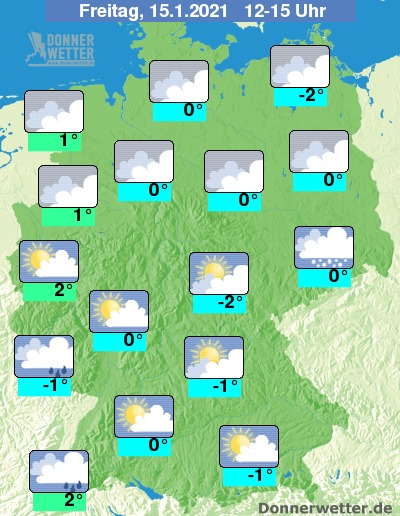 Am frühen Nachmittag fällt dort wo Frankreich nahe ist noch etwas Regen oder Schnee. Im Staubereich vom Erzgebirge gehen noch Schneeschauer nieder und es muss mit Glätte gerechnet werden. Sonst überwiegen im Norden die Wolken, während es in der Mitte und im Süden zu teils größeren Auflockerungen mit gelegentlichem Sonnenschein kommen kann.