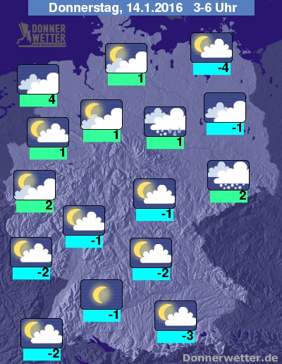 Am Donnerstag anfangs oft locker oder aufgelockert bewölkt, im Süden meist stark bewölkt, trocken, nachmittags im Süden und Westen bedeckt und zeitweise Regen, Schneeregen oder Schnee, -2 bis 5 Grad, an der Nordsee starker Wind.