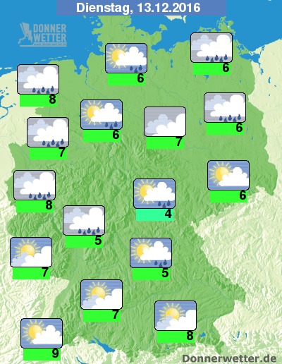 Am Dienstag zeigt sich der Himmel vielerorts stark bewölkt, die besten Chancen auf etwas Sonne bestehen in den südlichen Bundesländern. Die Regenwahrscheinlichkeit steigt, vor allem in der Nordhälfte ist immer wieder mit Niederschlägen zu rechnen. Die Temperaturen erreichen im Tagesverlauf Werte um 4 bis 9 Grad C.