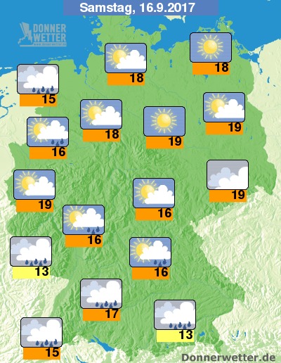 Heute ist der Himmel über dem Süden verbreitet dicht bewölkt und es fällt zeitweise, teils kräftiger Regen. Im Nordwesten zeigt sich das Wetter wechselhaft mit teils dichten Wolken, einzelnen Schauern oder Gewittern, jedoch auch Auflockerungen. Im großen Rest der Bundesrepublik scheint dagegen häufig die Sonne und es bleibt dazu weitgehend trocken. Die Temperatur steigt auf kühle 13 Grad im Saargau und bis 19 Grad in Berlin.