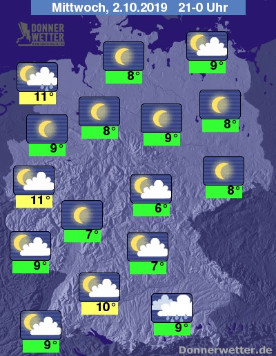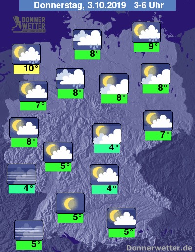 Während der zweiten Nachthälfte lassen die Niederschläge an den Alpen nach. Dafür ziehen über den Norden neue Schauer hinweg. Im übrigen Bereich kann man bei meist nur lockeren Wolken die Sterne beobachten. In der feuchten und weiter abkühlenden Luftmasse können sich bei einschlafendem Wind örtliche Nebelfelder bilden. Diese treten insbesondere im Südwesten etwas häufiger auf.